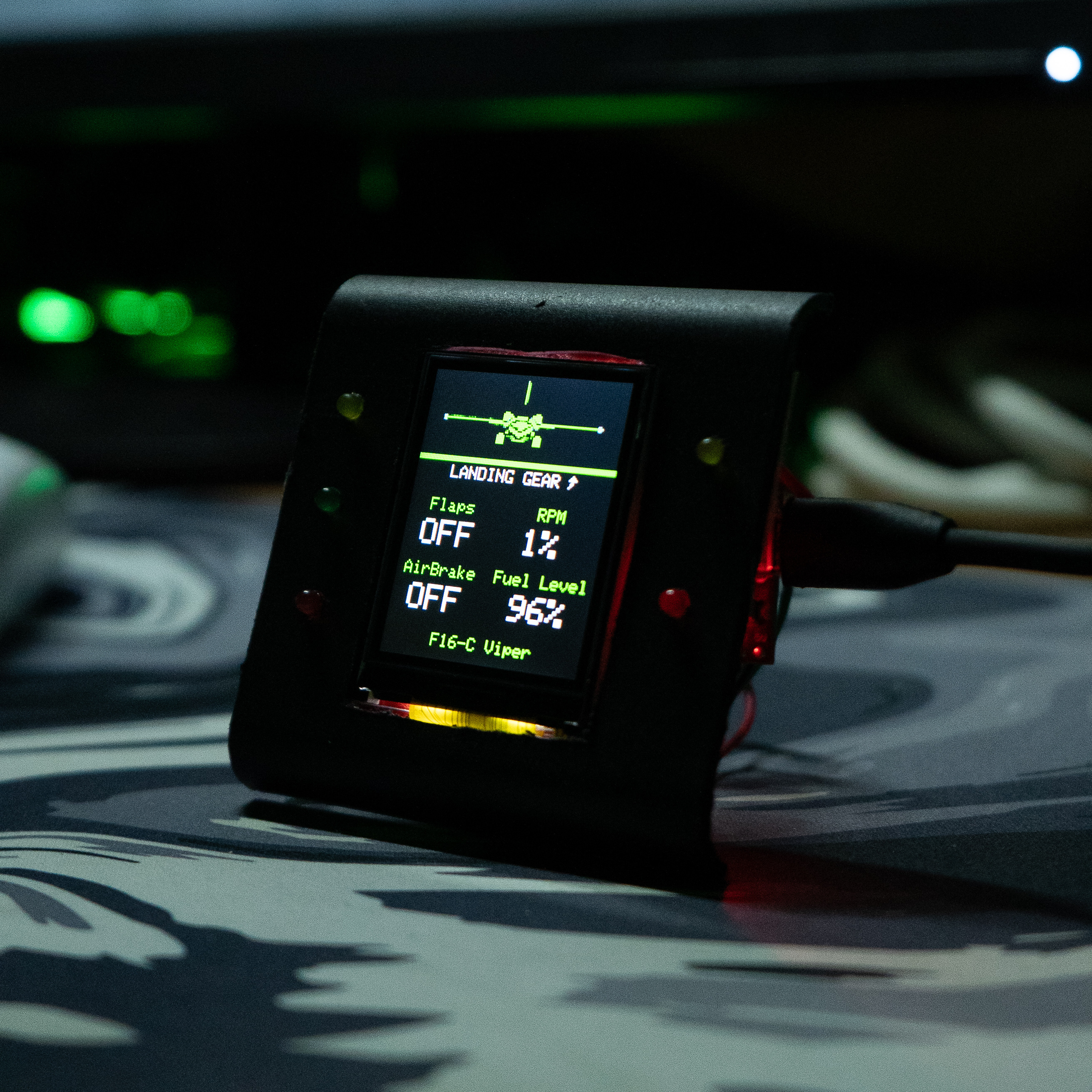 Bazat pe ESP32, conectat la DCS World. Afișează informații esențiale de zbor, unghiul de atac și oferă avertizări vizuale prin LED-uri dedicate.